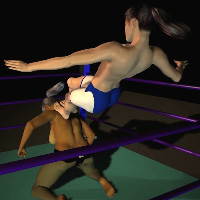 Sancha leapt down onto Leeha in a flying double leg kick. Her feet hit the Algerian's smack between her shoulder blades with a massive thump that reverberated round the auditorium.