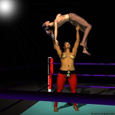 | Sonya lies spread-eagle on the mat moaning softly as the big Algerian looks down at her with pure contempt. Then Leeha moves to the corner and clambers to the top rope. Carefully she stands on the ropes and raises her arms like a high-board diver. Now she yells something unintelligible at the crowd before launching herself into space towards her smitten opponent. | ||
