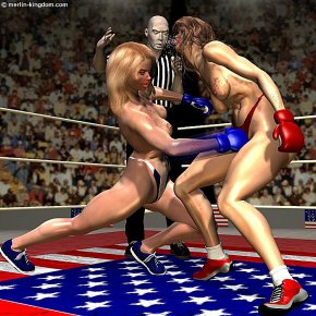 conditioning is struggling to keep the temperature below 90F (32C). Music blasts out signalling the start of the next part of the program as the Referee enters the arena followed by two young women wearing only thongs, boots and boxing gloves. In the dressing rooms the air con has failed completely and the temperature there has risen to well over 100F, so both women's bodies are already glistening with a sheen of sweat. The Referee climbs into the ring and the two young women follow him. The crowd noise dies away to a hush as he brings the fighters into the centre of the ring and lifts the microphone to his lips. The audience has been eagerly anticipating this fight as it has been highlighted on the program as a Grudge Fight. WARNING! This fight contains some bloody scenes. |